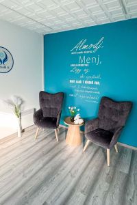 Barátságos érkező tér, ahol a vendégek kényelmesen megérkezhetnek, beszélgethetnek vagy készülődhetnek a foglalkozásra.